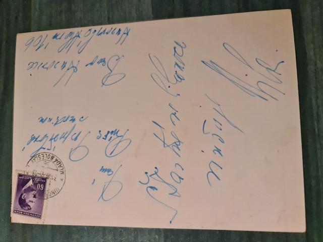 Poznámka: pohlednice s vlastní karikaturou + rukopis na rubu s podpisem