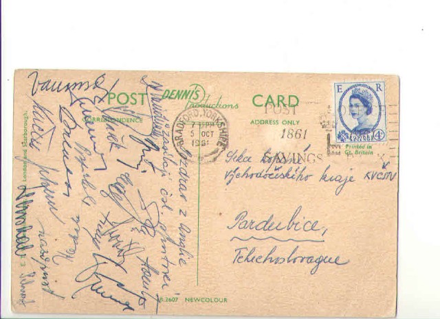 pohlednice Bradfordu z přípravného utkání proti Anglii jako přípravy na MS 1962. K rozpoznání podpisy Pluskal, Masopust, Kučera, Mašek, Pospíchal, Schrojf, Scherer, Novák, Tichý