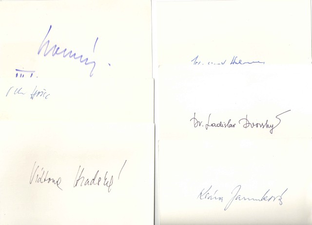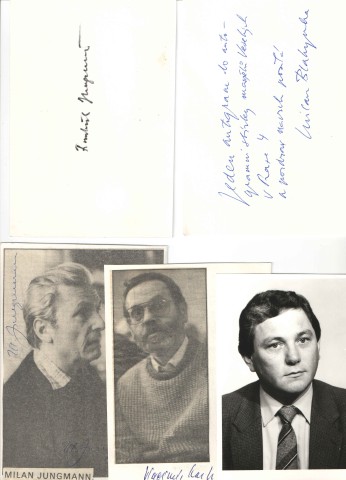 kartičky s podpisy: Milan Blahynka (1933), František Jungwirth (1920-1997),František Mandát (1952), Vladimír Karfík (1931931-1995), Milan Jungmann (1922-2012), Ladislav Dvorský (1931-1995), Vladimír Hulpach (1935), Klára Jarunková (1921-2005), Miroslav Honzík (1928), Petr Hořec 1926-2002), Viktoria Hradská (1944),