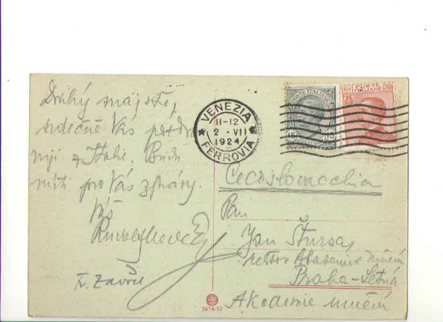 Oba podpisy na pohlednici z Benátek adresované rektoru AVU Janu Štursovi